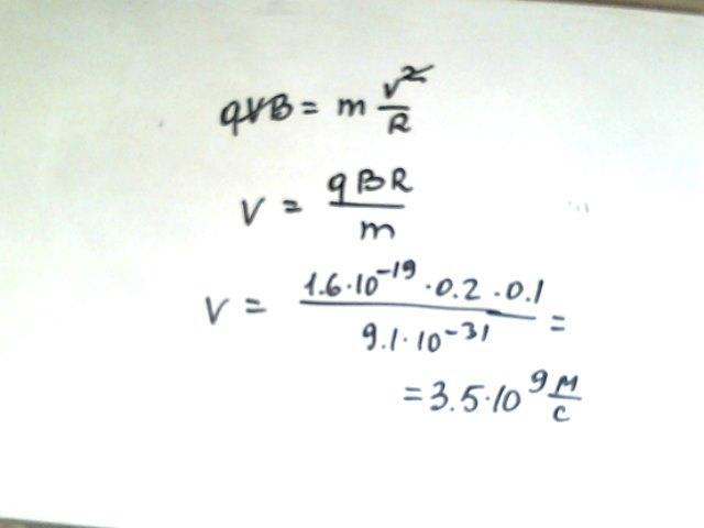 V = e*B*R*1/m = 1,6*10⁻¹⁹*0,2*0,1*10⁻³ / 9,11*10⁻³¹ ≈ 3,51*10⁶ м/с или 3,51 Мм/с - что реально...