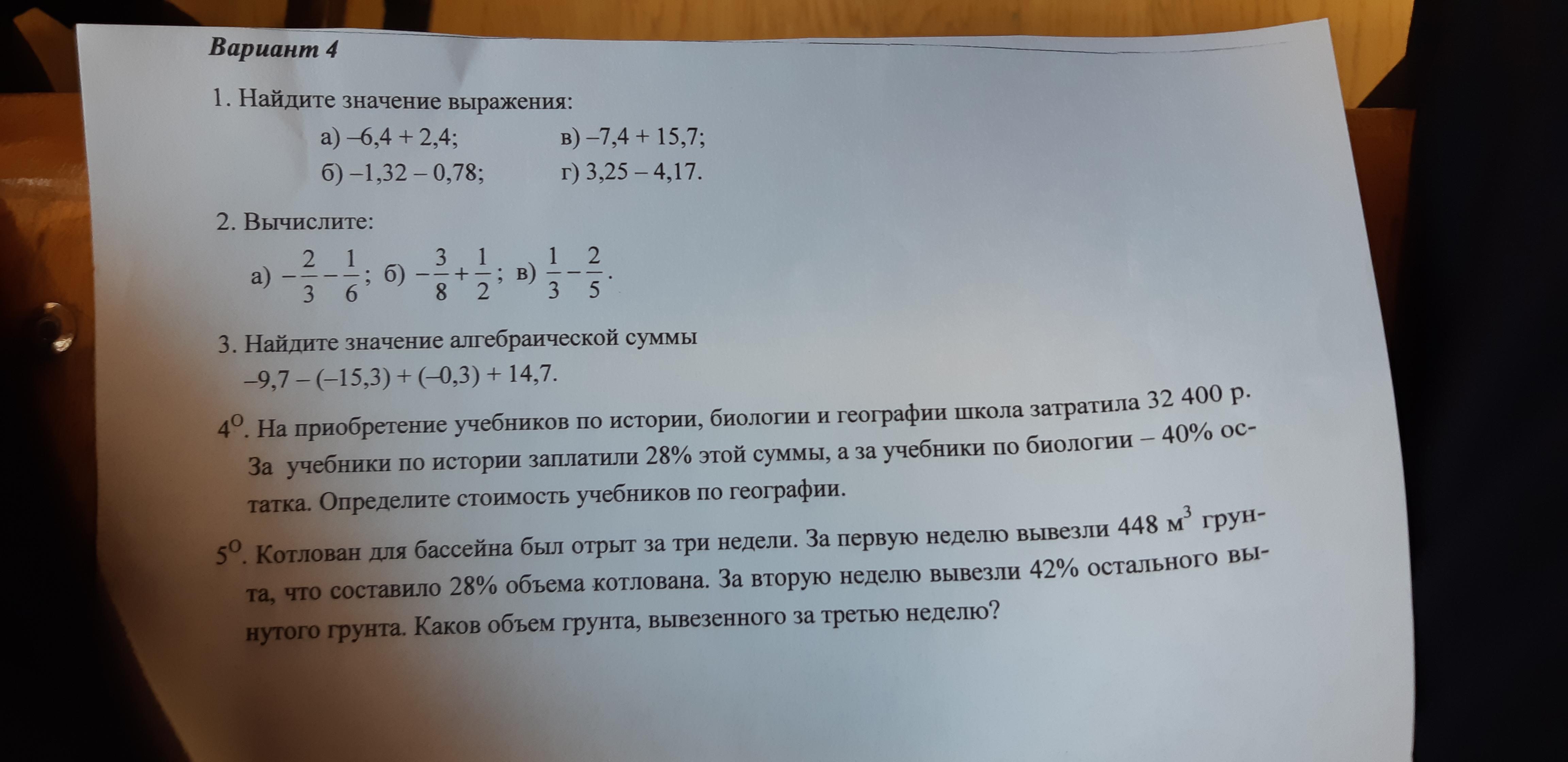 1 задание: a)-4; б)-2.1; в)8.3; г)-0.92. 4 задание: 32400руб= 100%; 100-40-28=32%. 3 задание: 19.6. 2 задание: а) -2/3-1/6=-12/18-3/18=-15/18; б) -3/8+1/2=-6/16+8/16=2/16; в) 1/3-2/5=5/15-6/15=-1/15.