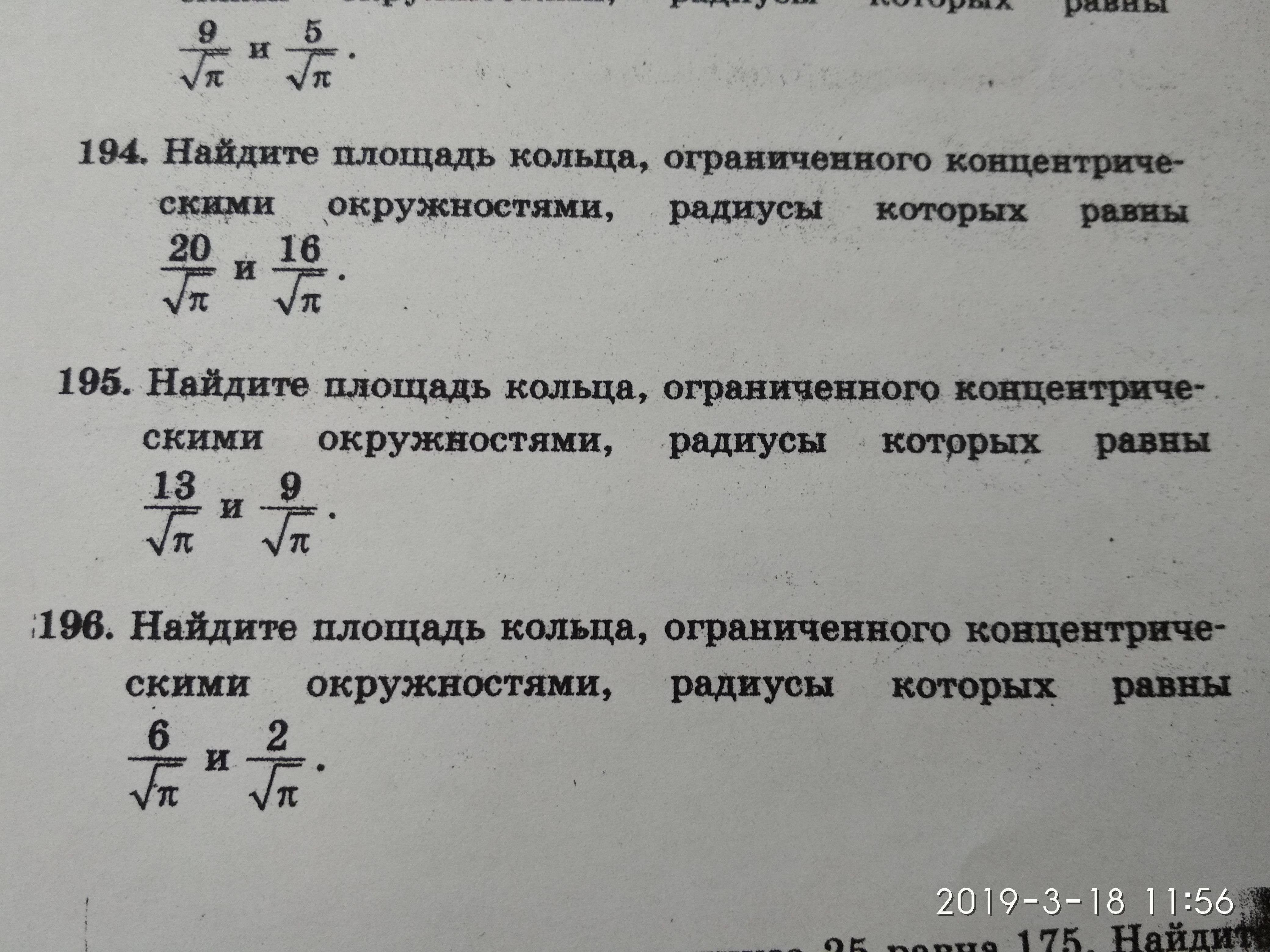 Площадь кольца, ограниченного концентрическими окружностями равна из площади большей окружности вычесть площадь меньшей.