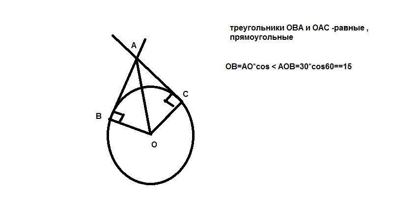 прямые AB и AC касаются окружности с центром О в точках B и C. Найдите радиус окружности, если <BOC=120°, AO=30см.