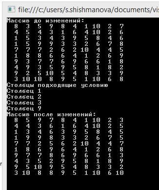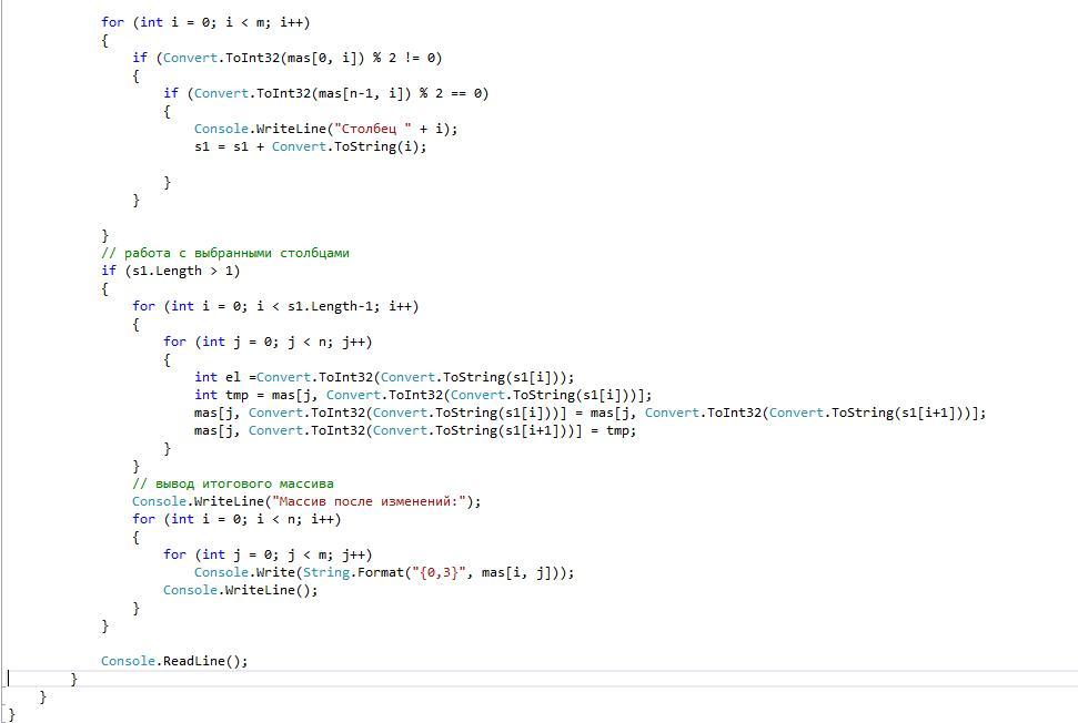 Помогите написать на С#. Дан двумерный целочисленный массив А размерностью NxM. Поменять местами. Столбцы, содержащие первый нечетный и последний четный элементы