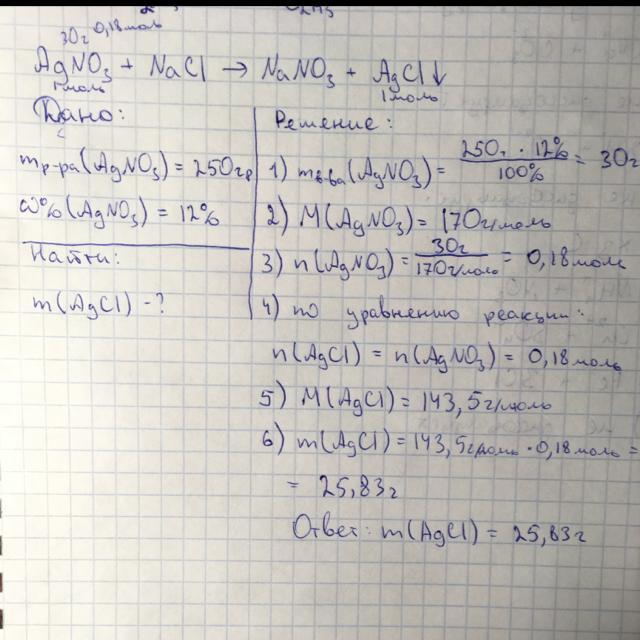 К 250 гр. 12% раствора нитрата серебра добавили раствор хлорида натрия. Найти массу образовавшегося осадка?