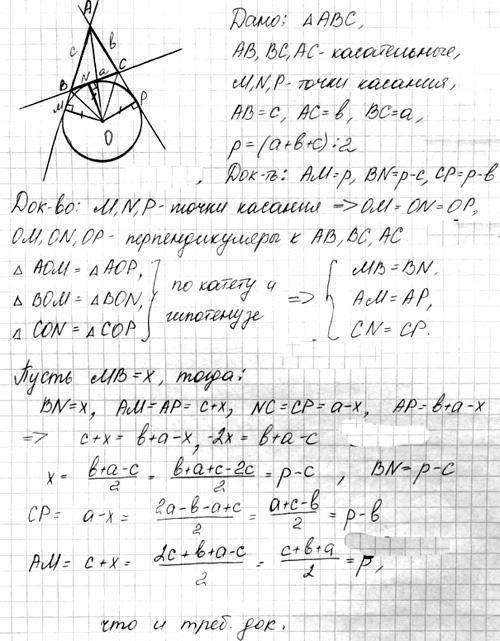 Докажите, что прямые AB, BC и CA касаются одной окружности с центром вне треугольника ABC, но внутри угла BAC, то отрезки касательных от вершин A, B и C до точек касания соответственно равны p, p-c и p-b (p - полупериметр, a=BC, b=AC, c=AB).