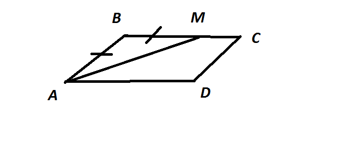 Скажите правильно ли я решила задачу : На стороне BC параллелограмма ABCD взята точка M так, что AB=BM. Докажите, что AM - биссектриса угла BAD . Решение : Треугольник ABM - равнобедренный так как AB=BM и угол BAD = углу BMA. Угол MAD= углу BMA так как это накрест лежащие углы при параллельных прямых BC и AD и секущей AM. Значит угол BAD= углу BDA= углу MAD. Так как угол BAM= углу MAD то AM биссектриса угла BAD. Вот рисунок, только скажите честно)