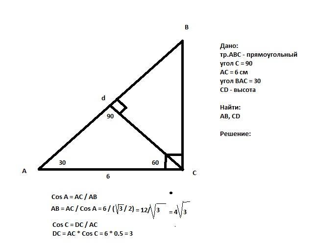 1. В прямоугольном треугольнике АВС угол С = 90 градусов , АС = 6 см , угол ВАС = 30 градусов.