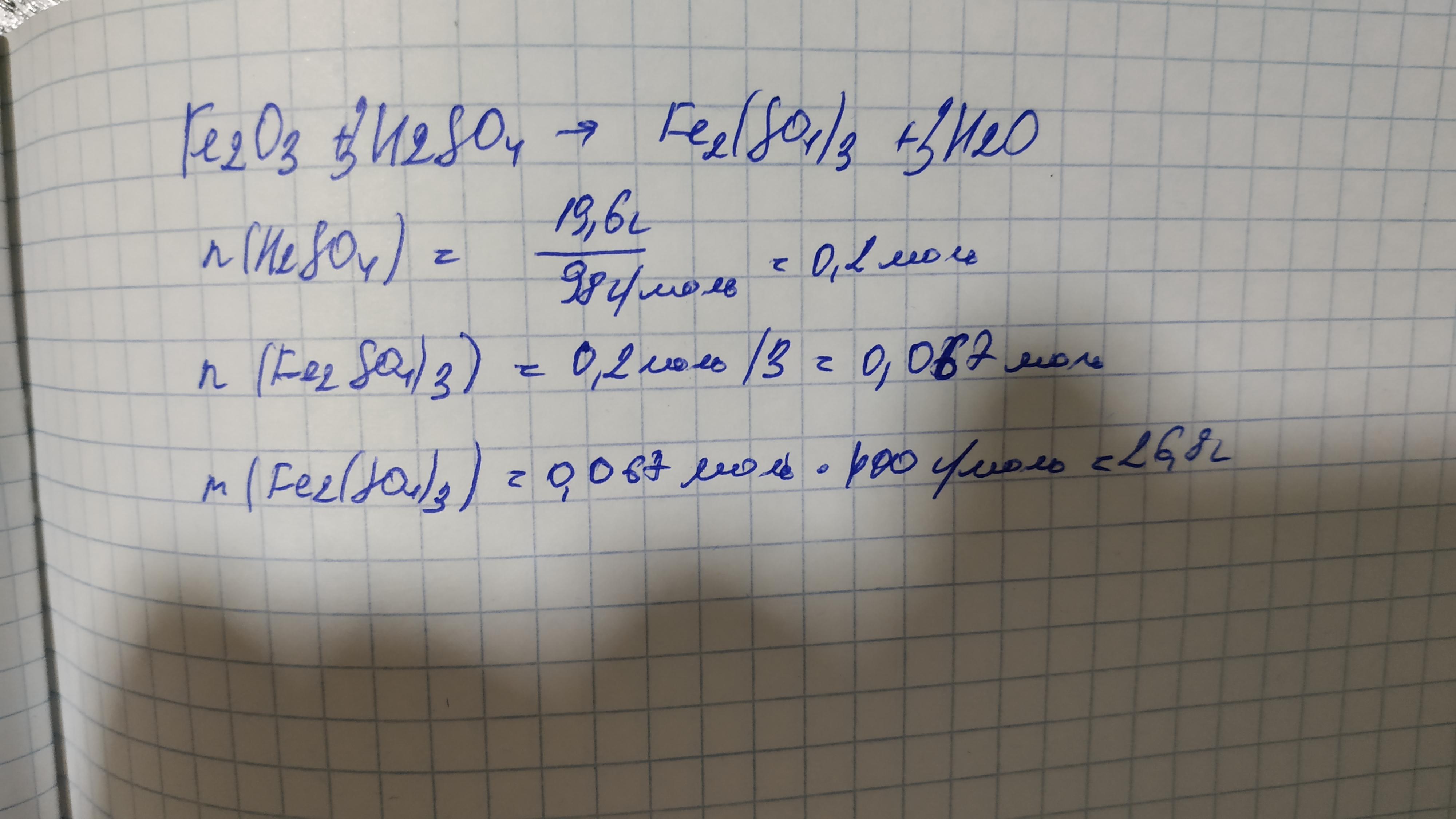 Какая масса соли образовалась при взаимодействии Fe (III) оксида с серной кислотой с массой 19,6 г