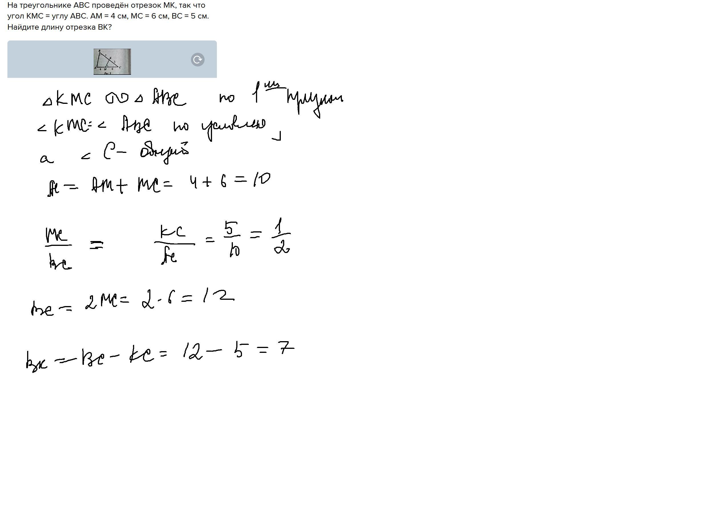 На треугольнике ABC проведён отрезок МК, так что угол KМС = углу ABC. AM = 4 см, MC = 6 см, BC = 5 см. Найдите длину отрезка BK?