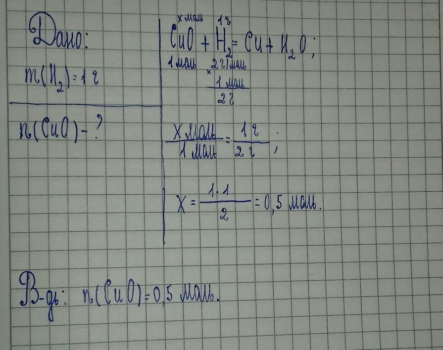 Количество вещества оксида меди 2 необходимое для вступление в реакцию с водородом массой 1 г по формуле CuO+H2=Cu+H2O