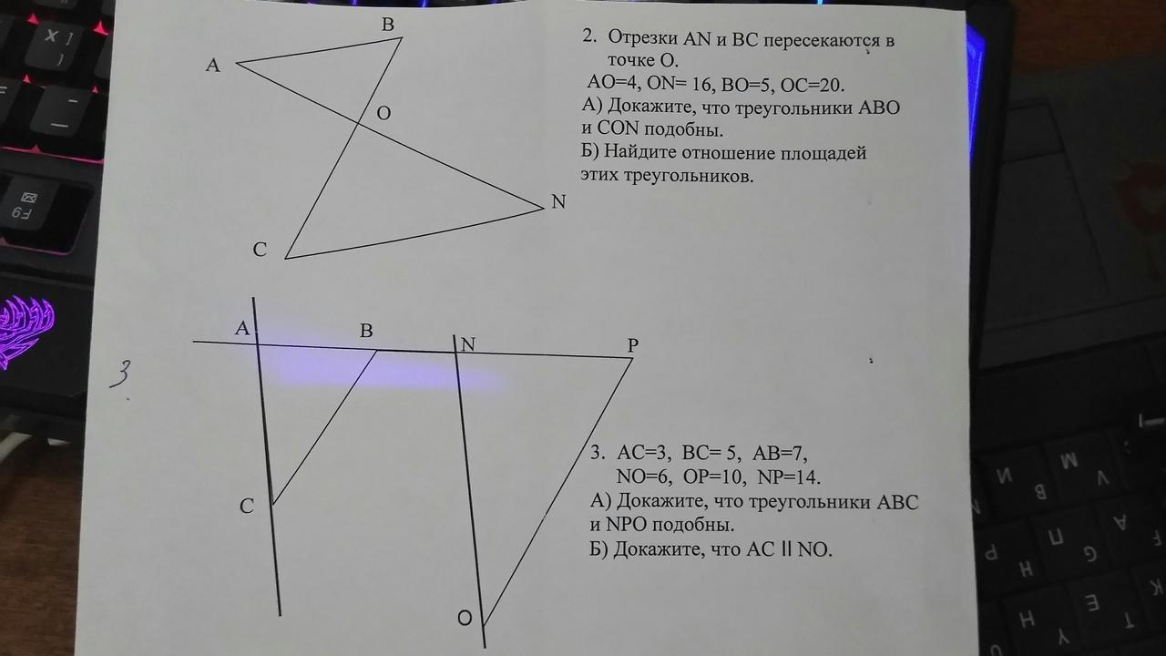 А) Так как АС/NO=3/6=1/2; AB/NP=7/14=1/2; BC/PO=5/10=1/2, то получаем что АС/NO=AB/NP=BC/PO, а значит треугольники подобны по третьему признаку подобия (три стороны одного треугольника пропорциональны трем сторонам другого треугольника)