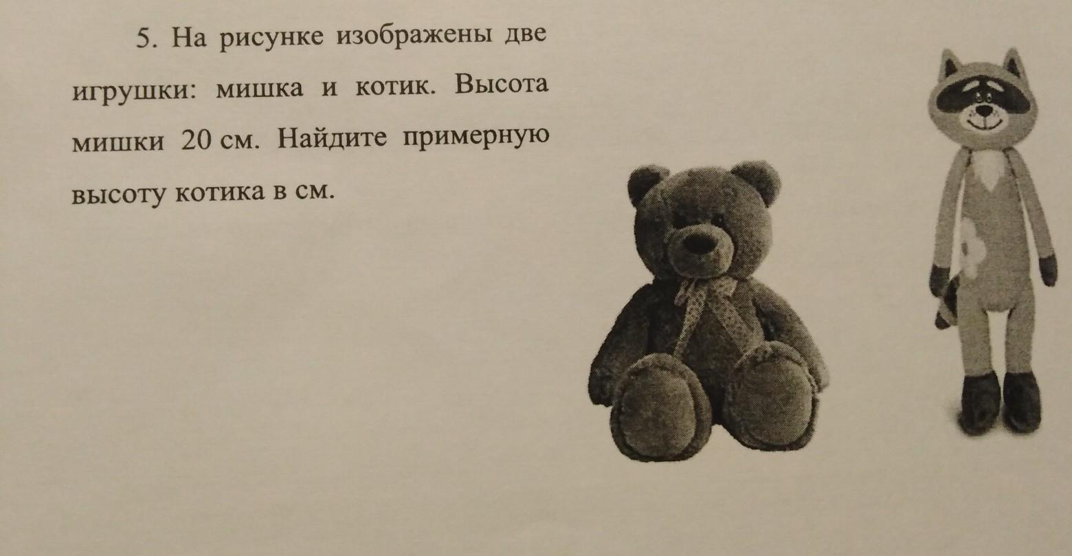 из рисунка видно ,что кот выше на голову медведя, если замерить по линейки то медведь 7 см, а кот 7+2.5(голова). если все пересчитать то будет 29.5