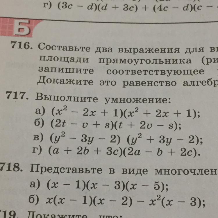 1); ; (x^2-2x+1)(x^2+2x+1)=(x^2+1)^2-(2x)^2=\\=x^4+2x^2+1-4x^2=x^4-2x^2+1=(x^2-1)^2\\2); ; (2t-v+s)(t+2v-s)=Big (t+[, t-(v-s)]Big )Big (v+[, t+(v-s)]Big )=\\=tv+t(t+v-s)+(t-v+s)v+Big (t^2-(v-s)^2Big )=\\=tv+t^2+tv-ts+tv-v^2+vs+t^2-(v^2-2vs+s^2)=\\=2t^2+-2v^2-s^2+3tv+3vs-ts\\3); ; (y^2-3y-2)(y^2+3y-2)=Big ((y^2-2)-3yBig )Big ((y^2-2)+3yBig )=\\=(y^2-2)^2-(3y)^2=y^4-4y^2+4-9y^2=y^4-13y^2+4\\4); ; (a+2b+3c)(2a-b+2c)=\\=2a^2-ab+2ac+4ab-2b^2+4bc+6ac-3bc+6c^2=\\=2a^2-3b^2+6c^2+3ab+8ac+bc