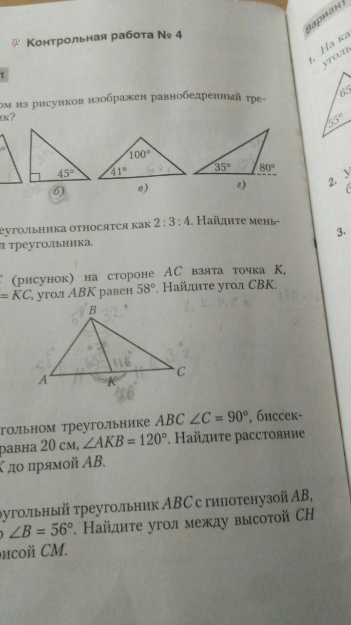 В ∆АВС(рисунок) на стороне АС взята точка К,АК=ВК=КС угол АВК равен 58°.Найдите угол СВК.