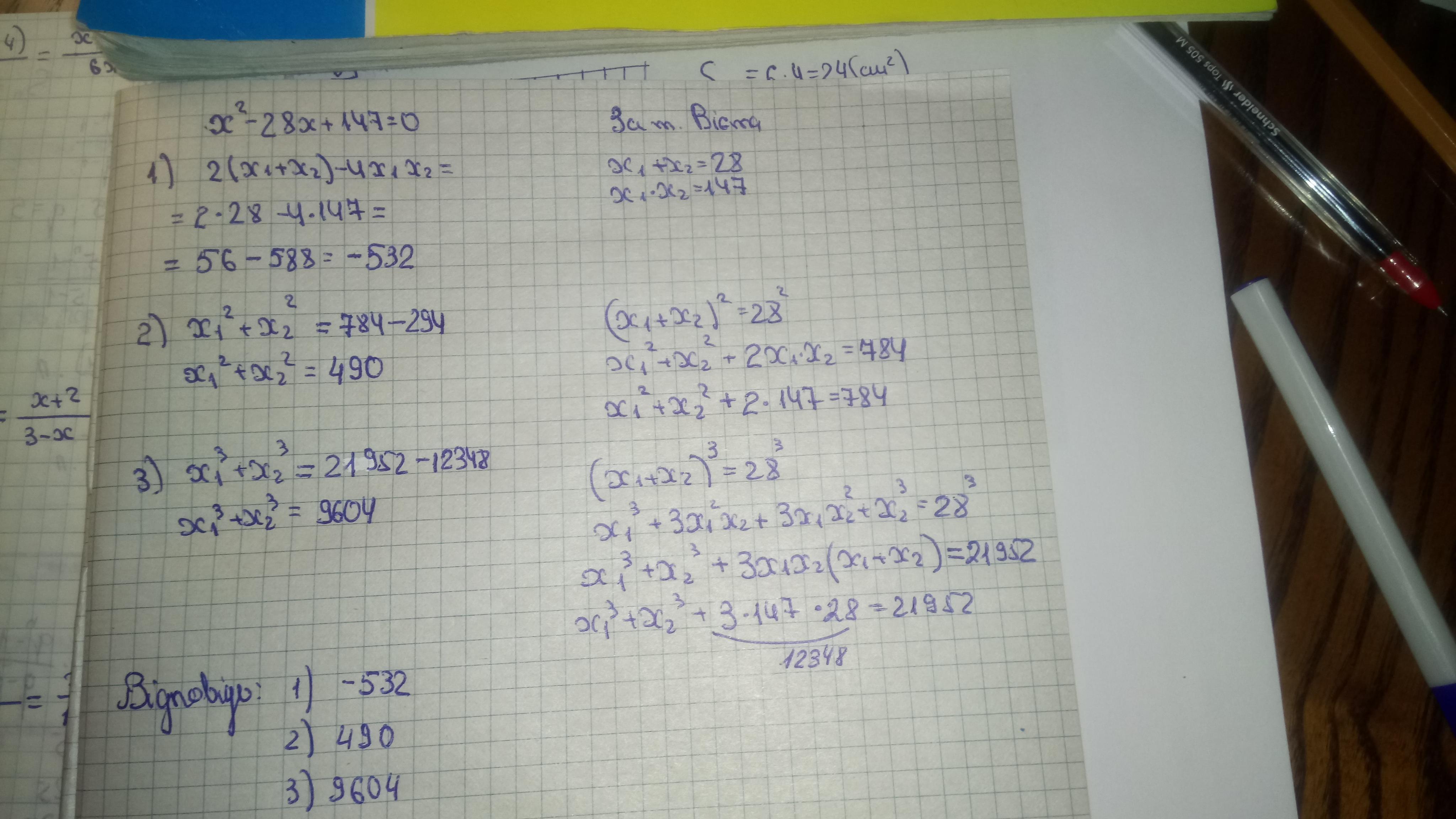 3) x₁³ + x₂³ = (x₁ + x₂)((x₁ + x₂)² - 3x₁x₂) = 28 * (28² - 3 * 147) =