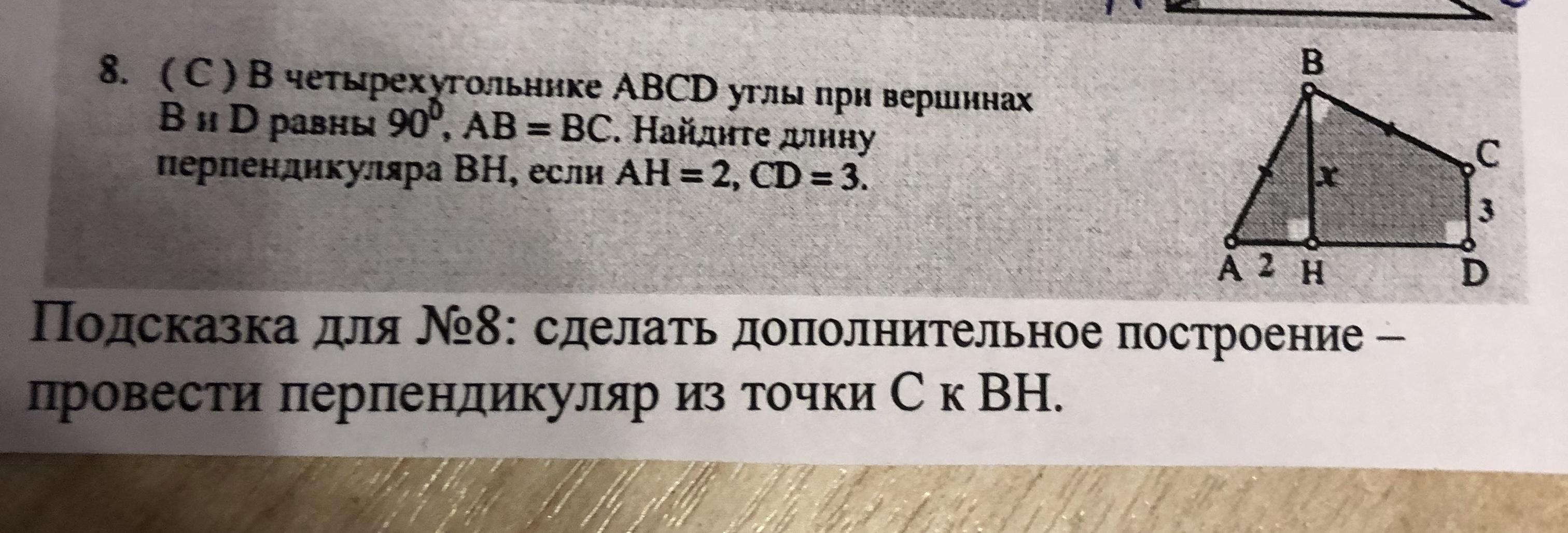 в четырехугольнике АВСD углы при вершинах в и d прямые, ав=вс. найдите длину перпендикуляра вн если ан=2 сd=3