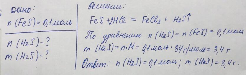 Вычесли количество вещества и массу сероводорода , который можно получить из сульфида железа(2) количеством вещества 0,1 моль при его взаимодействии с соляной кислотой