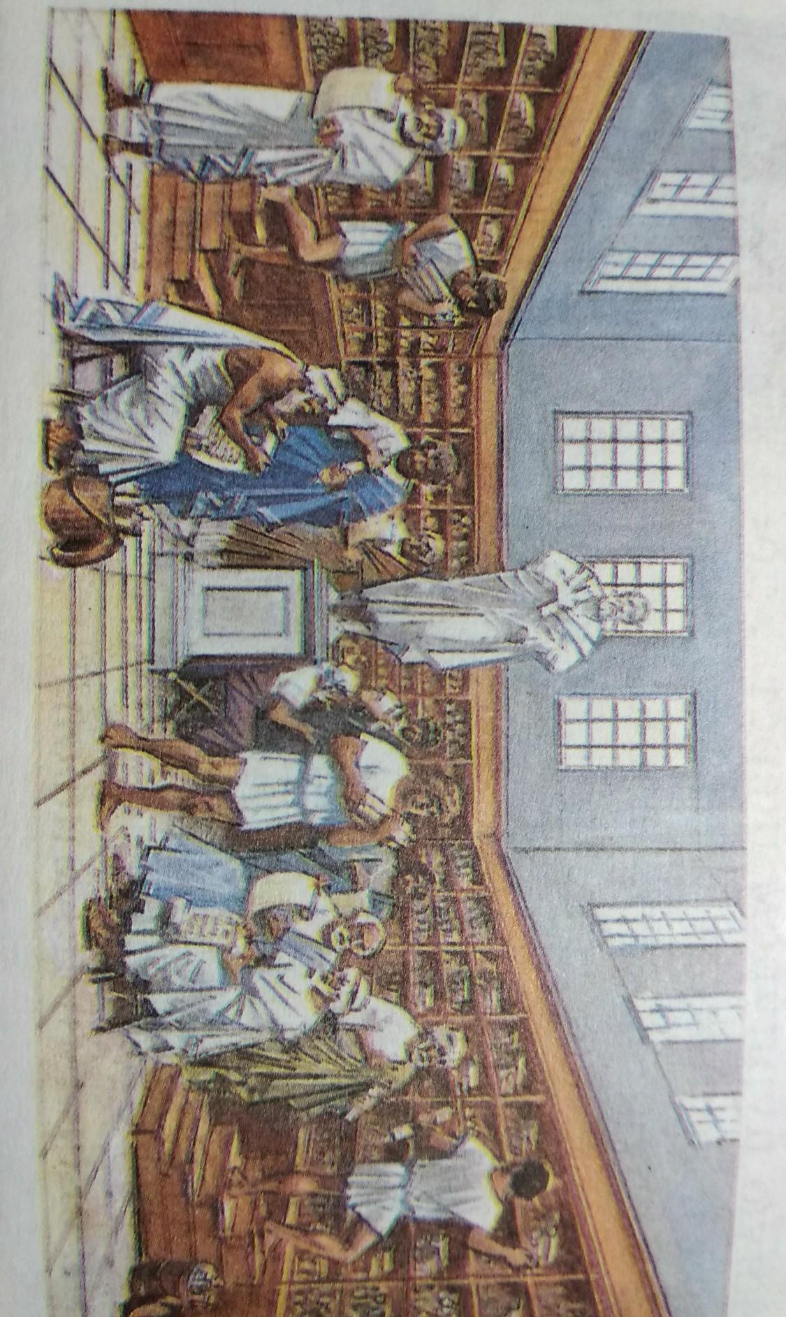 Мы видим что на картине изображены читатели в белой одежде. В синей одежде стоит библиотекарь, как мы видим в дневное время суток в библиотеке было много читателей, после того как библиотека згарела она стала не знаю чем