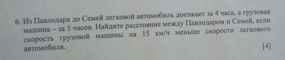 Расстояние x км. Скорость легковой x/4 км/ч, скорость грузовой x/5 км/ч, что на 15 км/ч меньше скорости легковой.