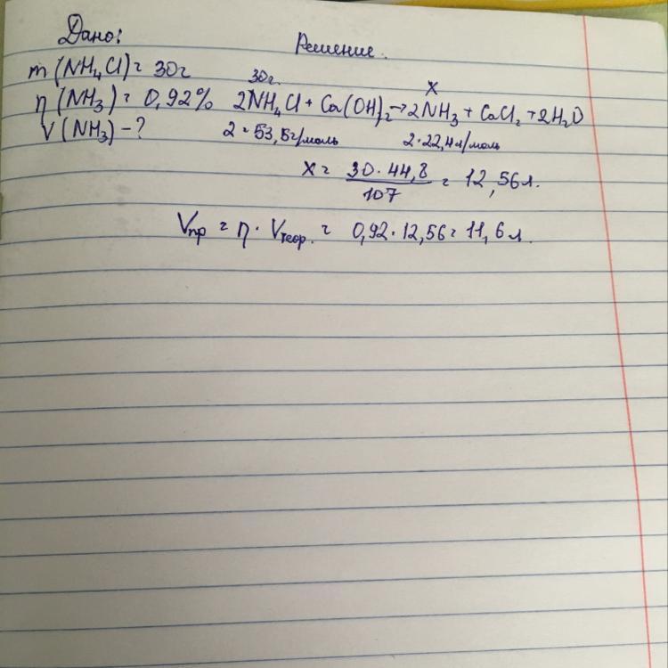3)Вычислите объём аммиака (н.у.), который можно получить, нагревая 30 г хлорида аммония с избытком гидроксида кальция, приняв, что объёмная доля выхода аммиака составляет 0,92