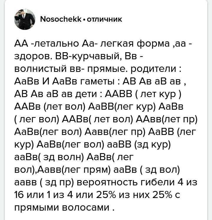 СРОЧНО!!!!! Талассемия (нарушение синтеза гемоглобина и формы эритроцитов ) наследуется как неполностью доминантный аутосомный признак. У гомозигот заболевание заканчивается смертью в 90-95% случаев, а у гетерозигот заболевание протекает относительно легко в семье где оба родителя страдали легкой формой талассемии и имели волнистые волосы родились двое здоровых детей один из которых имел гладкие волосы а второй курчавые. Определить вероятность гибели детей в этой семье, какая часть умерших будет иметь гладкие волосы? Решение полностью с дано и решение. СРОЧНО!!! Заранее спасибо)