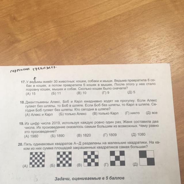 17. У ведьмы живёт 30 животных : кошки , собаки и мыши. Ведьма превратила 6 собак в кошек, а потом превратила 5 кошек в мышек. После этого у неё стало поровну кошек , мышек и собак. Сколько кошек было сначала ?