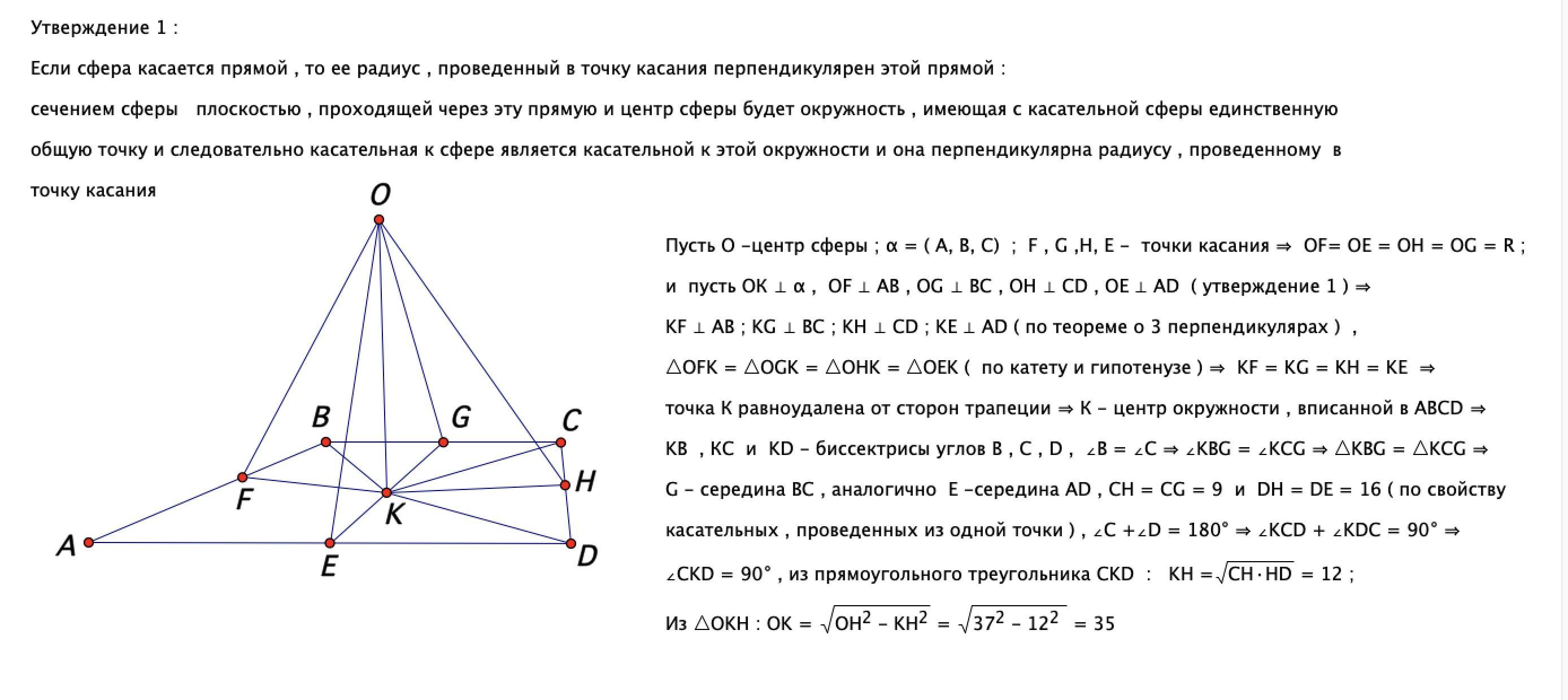 Шap , радиус которого 37 см , касается всех сторон равнобедренной трапеции . Основания трапеции 18 и 32 см . Найдите расстояние от центра шара до плоскости трапеции