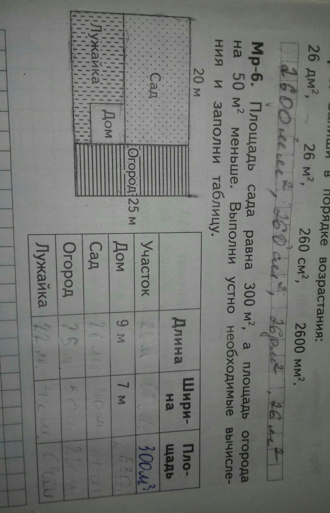 Площадь сада равна 300 м2 , а площадь огорода на 50 м 2 меньше. Выполни устно необходимые вычисления и заполни таблицу