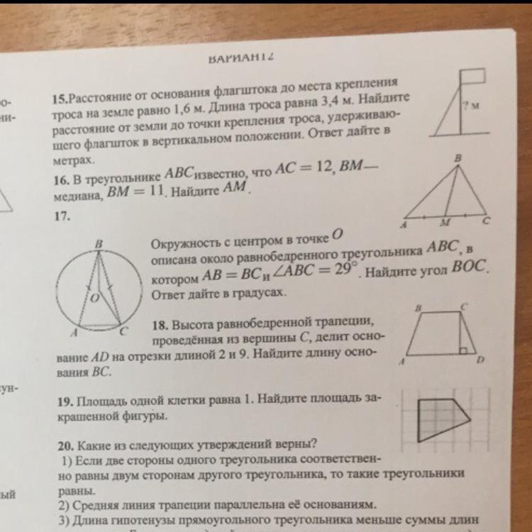 15 задание: по теореме Пифагора- а= 3,4²-1.6² и все это под корнем = корень из 9= 3