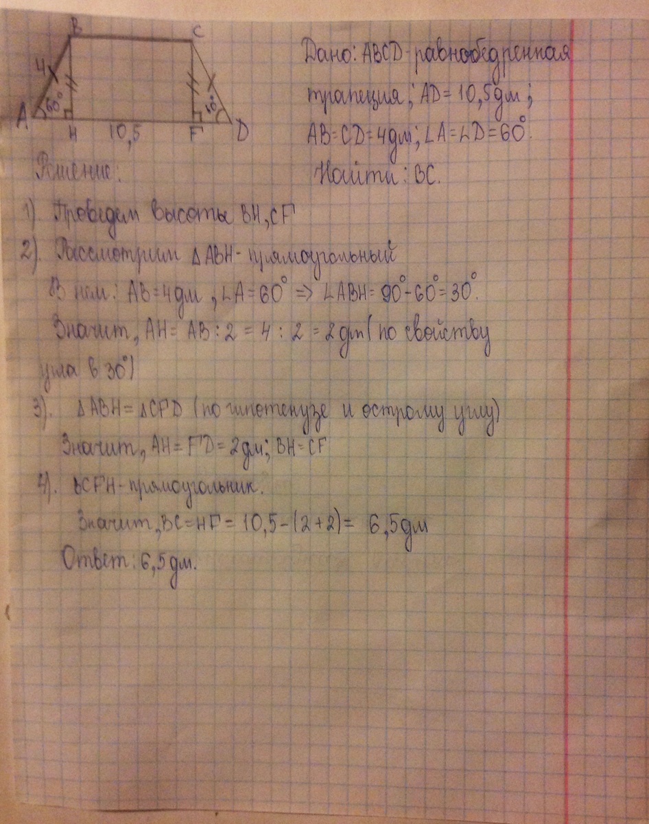большее основание равнобедренной трапеции равно 10,5 дм, ее боковая сторона-4 дм, а угол между ними-60 градусов. Найдите длину меньшего основания трапеции
