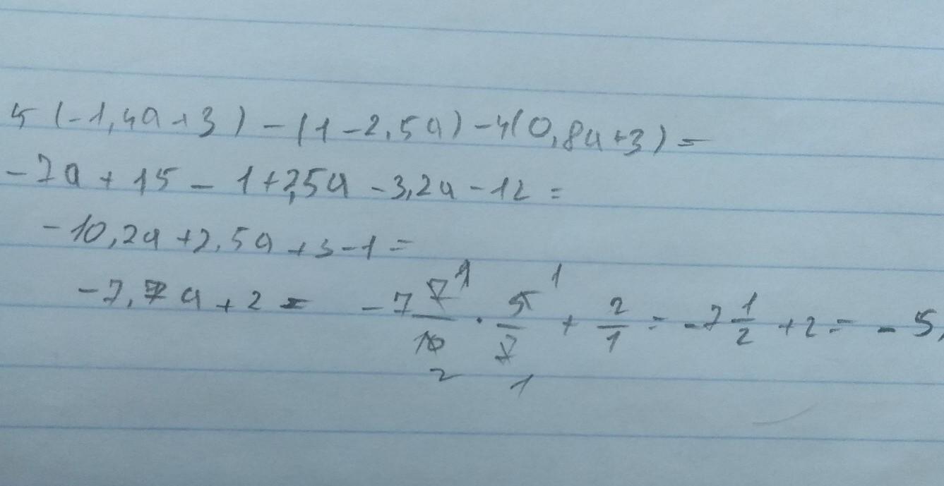 5( -1,4a + 3) - (1 - 2,5a) - 4( 0,8a + 3) и вычислите его значение при a = 5/7 /-дробная черта