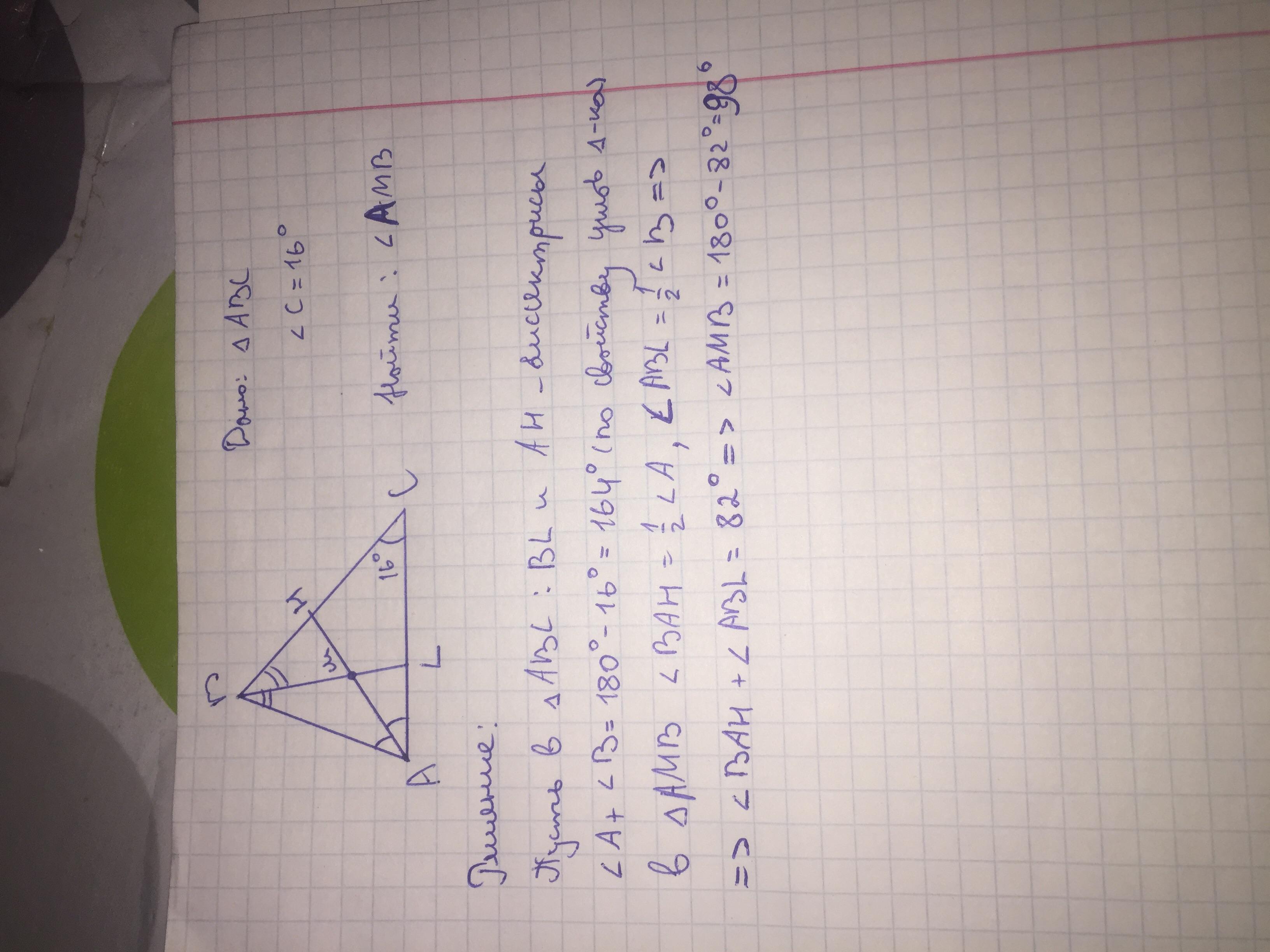 Биссектрисы углов A и B треугольников ABC пересикаются в точке M найди угол AMB ,если угол C=16°