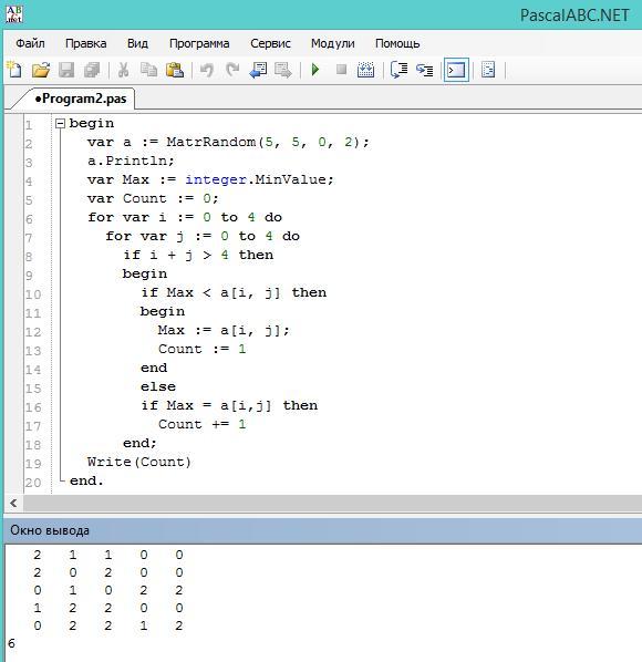 Массив 5х5 заполнить случайными числами [0;2]. Посчитать количество максимальных элементов в массиве под побочной диагональю.