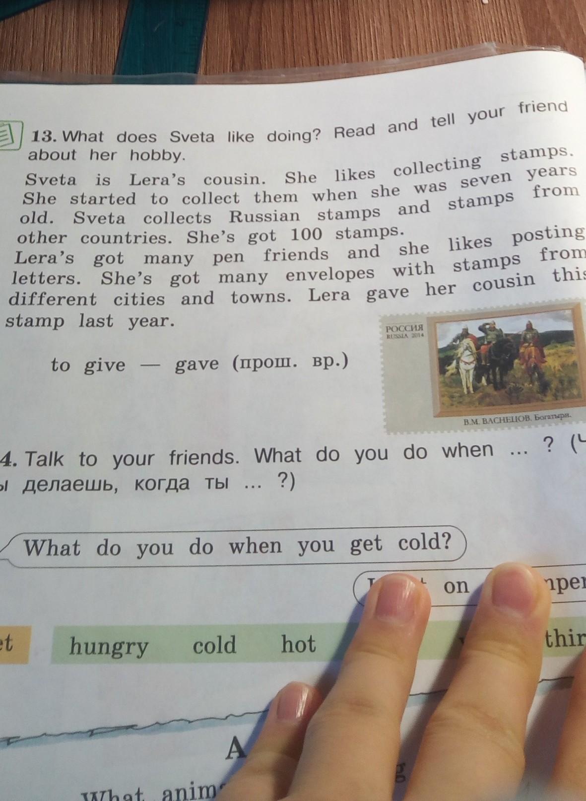 Света кузина Леры. Она любит коллекционировать марки. Она начала из коллекционировать когда ей было семь лет. Света коллекционирует марки из России и из других стран. У неё сто марок.у Леры очень много друзей и она пишет им письма. У неё много марок из разных городов. Лера подарила её кузине эту марку прошлым летом.