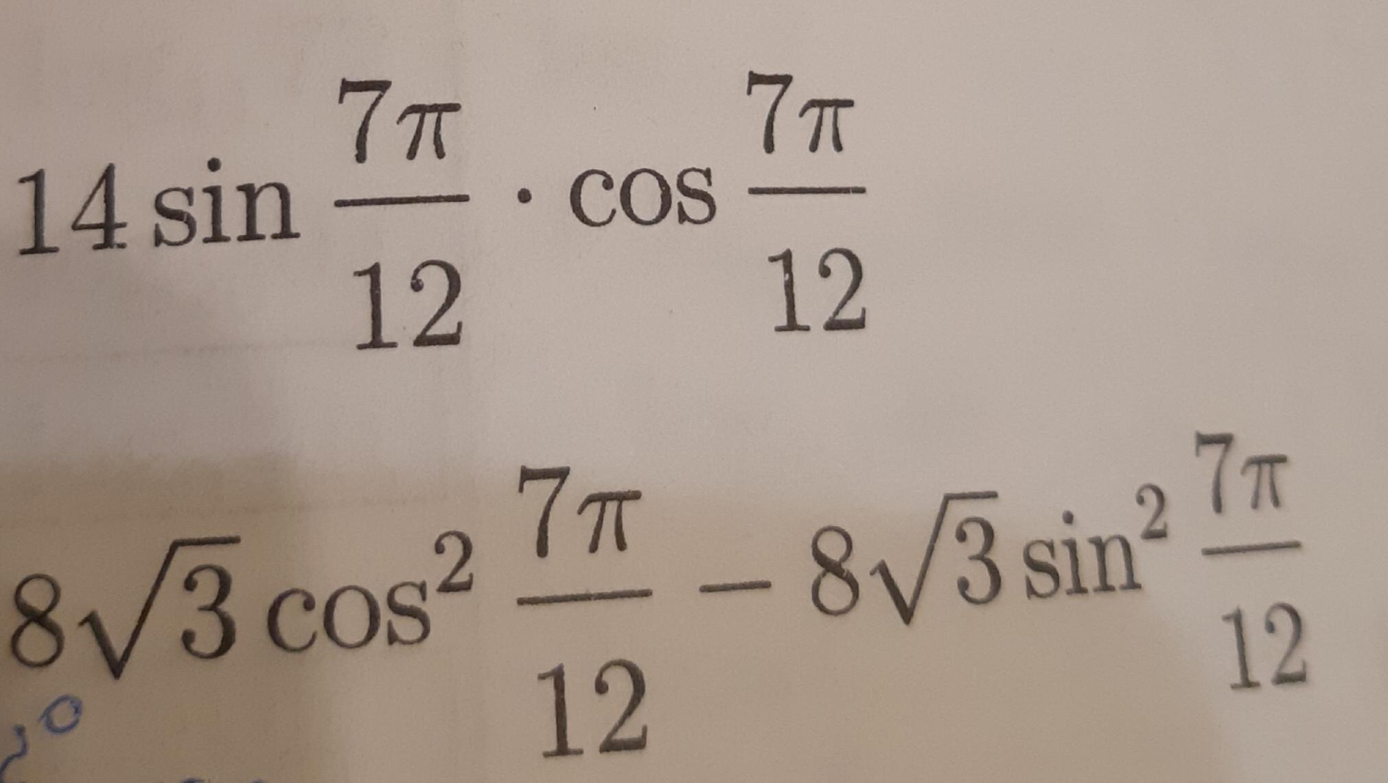 2)8sqrt{3}Cos^{2} frac{7pi }{12}-8sqrt{3}Sin^{2}frac{7pi }{12}=8sqrt{3}(Cos^{2}frac{7pi }{12} -Sin^{2}frac{7pi }{12})=8sqrt{3}Cos(2*frac{7pi }{12})=8sqrt{3}Cosfrac{7pi }{6}=8sqrt{3}Cos(pi+frac{pi }{6})=8sqrt{3}*(-Cosfrac{pi }{6})=-8sqrt{3}*frac{sqrt{3} }{2}=-12
