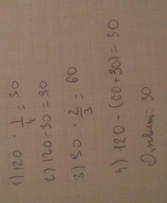 Первое действие находим 1/4, второе находим сколько осталось, третье остаток на 2/3, четвёртое узнаем сколько всего осталось