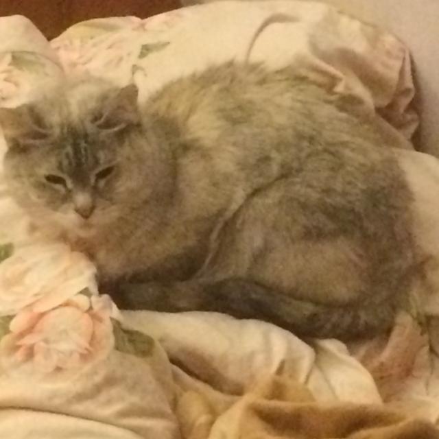 У меня есть домашнее животное-это кошка Боня. Я её очень люблю. У Бони пушистая шерсть, окрашенная в серо-белые оттенки. Моя кошка очень добрая и дружелюбная, она не упустит возможности получить порцию ласки. На её мордочке розовенький носик, чёрные глазки и ушки в остро. На спине еле виднеются серенькие полосочки. Моя кошка-это моё сокровище.