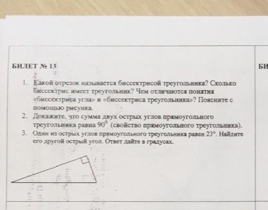 Сумма острых углов прямоугольного треугольника равна 90°. Второй угол равен (90-23)=67°.