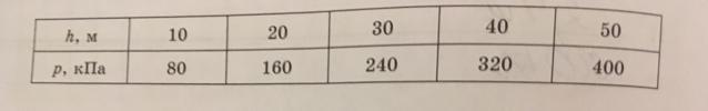 В таблице даны значения давления p на разной глубине h. Каким будет давление жидкости на глубине h=45 м?