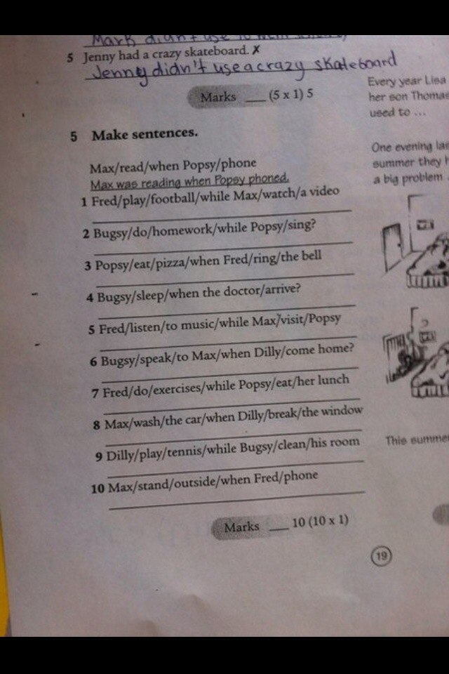 7. Fred was doing exercises while Popsy was eating her lunch.