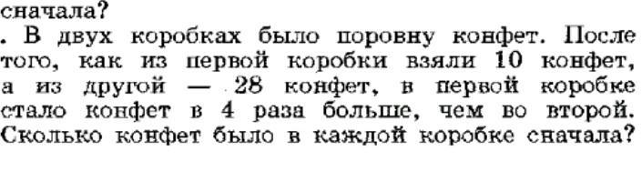 В двух коробках было поровну конфет.После того,как из первой коробки взяли 10 конфет,а из другой-28 конфет,в первой коробке стало конфет в 4 раза больше,чем во второй.Сколько конфет в каждой коробке было сначала?Решать уравнением,решите пожалуйста!!!