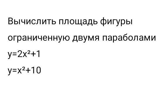 Найдем точки пересечения графиков 2x^2+1=x^2+10, x^2-9=0, x=3 и x=-3, это пределы интегрирования, S= интеграл от -3 до 3 (x^2+10-2x^2-1)dx=инт-л (-x^2+9)dx=-x^3/3+9x I от -3 до 3=-27/3+27-(27/3-27)=-9+27-9+27=54-18=36