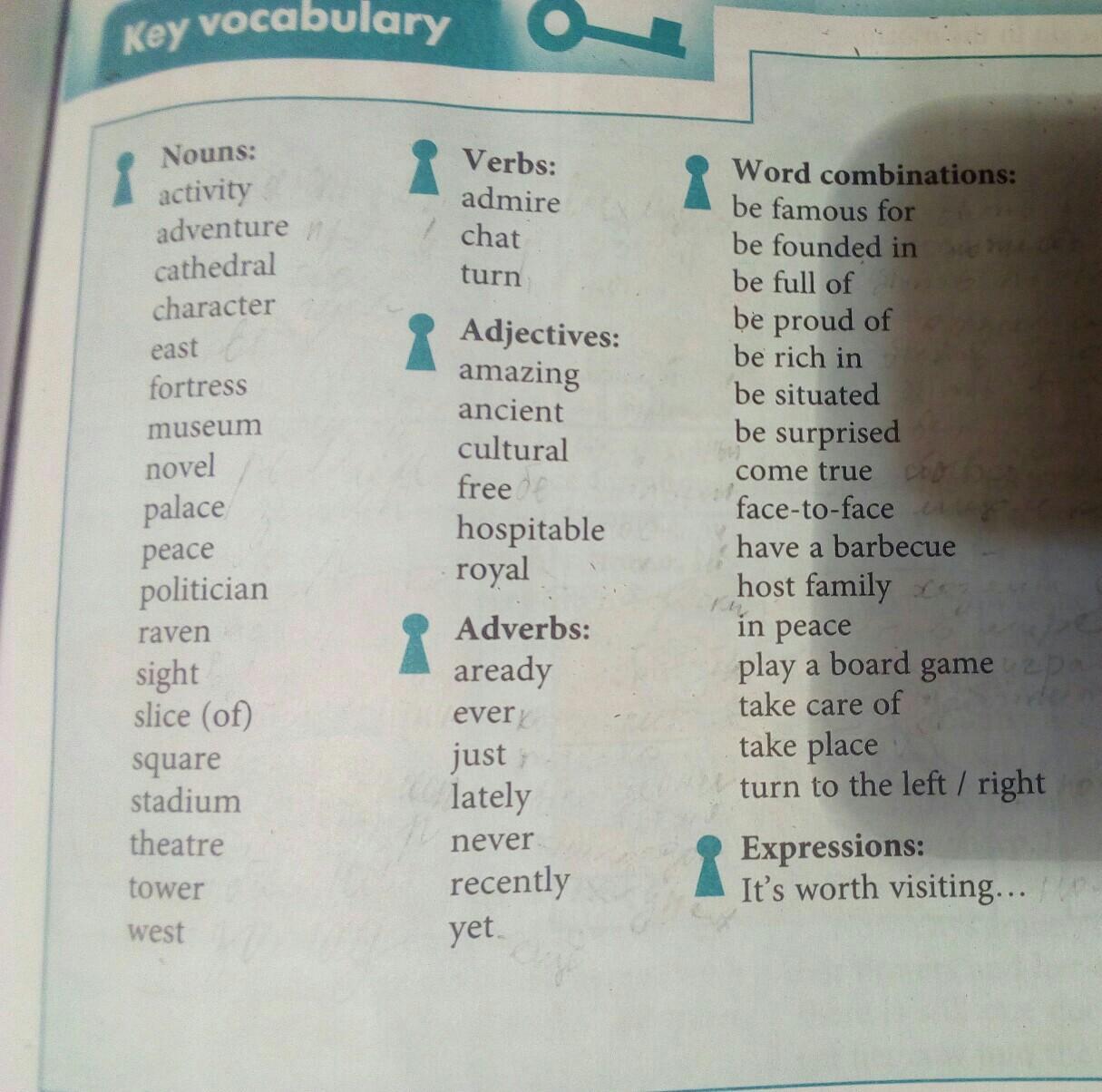 Дієслова: діяльність пригодницький собор персонаж литий фортеця музей роман палац миру політик ворона Комбінації слів відомі бути засновані в повному пишатися бути багатими бути здивовані збудуватися лицем до лиця мати барбекю господарі родина dmire Прикметники дивовижний стародавній культурний вільний гостинний королівський Прислівники: у мирі скибочка () квадратний стадіон театр башта захід ареада коли-небудь тільки останнім часом ніколи не грати настільна гра піклуватися про відбутися повернути ліворуч / право Вирази: Це варто відвідати. Хз чи правильно