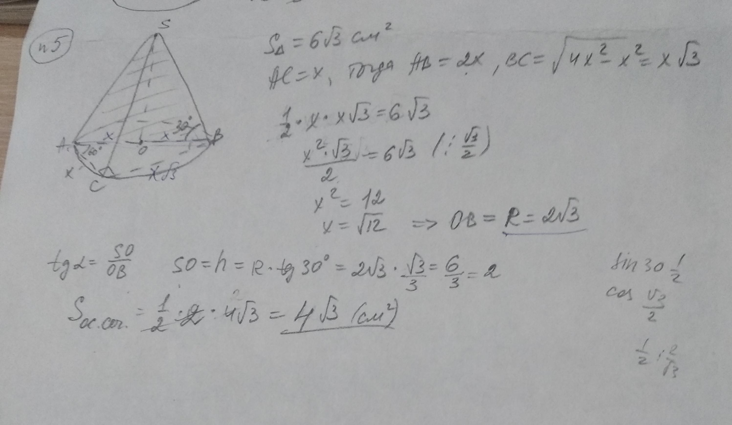 конус описан около пирамиды. Основание пирамиды прямоугольный треугольник, градусная мера острого угла равна 60°, а площадь 6корннй из 3. Вычислите площадь осевого сечения конуса, если градусная мера угла наклона образующей конуса к плоскости основания равна 30°