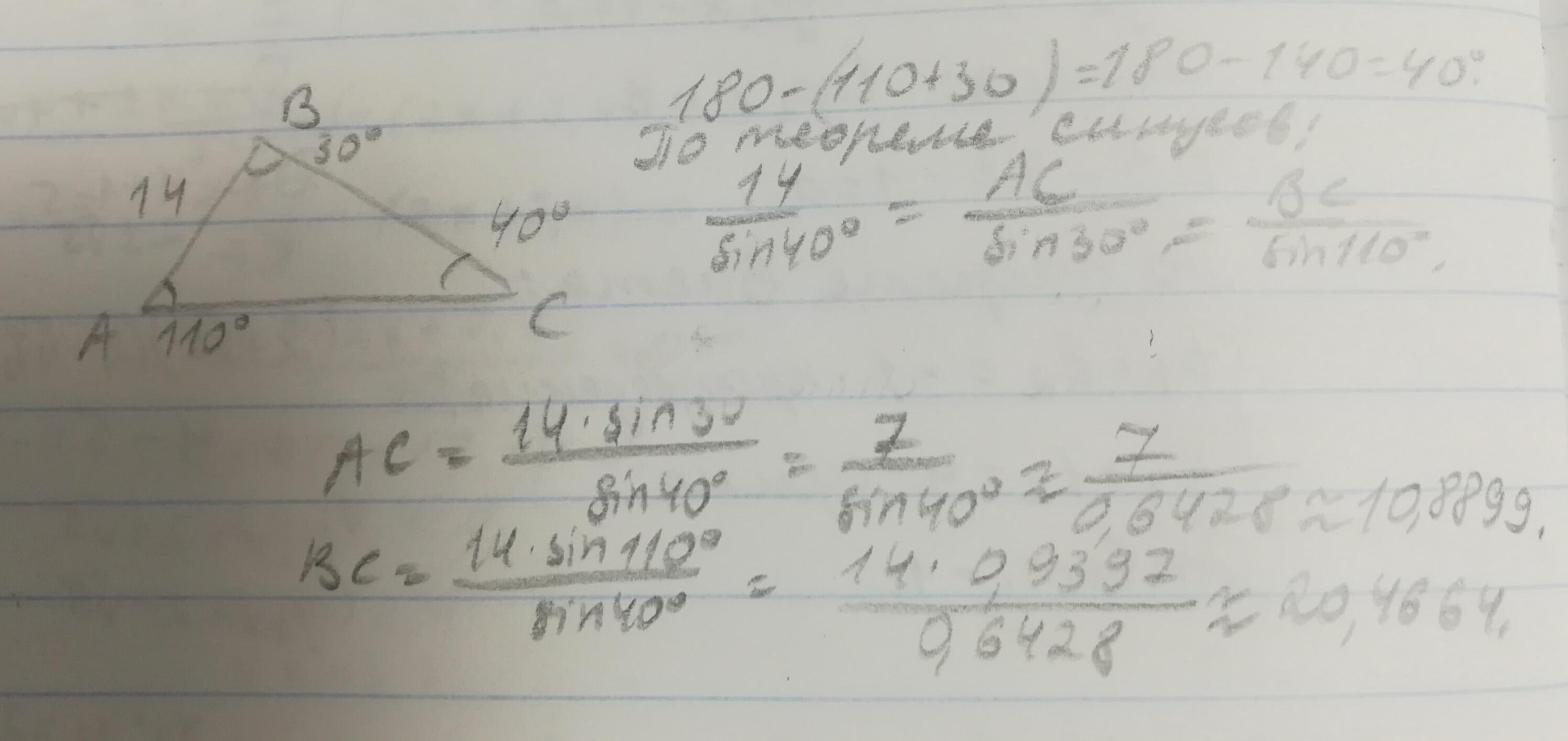 Решите треугольник: АВ = 14 угол А=110 угол В=30