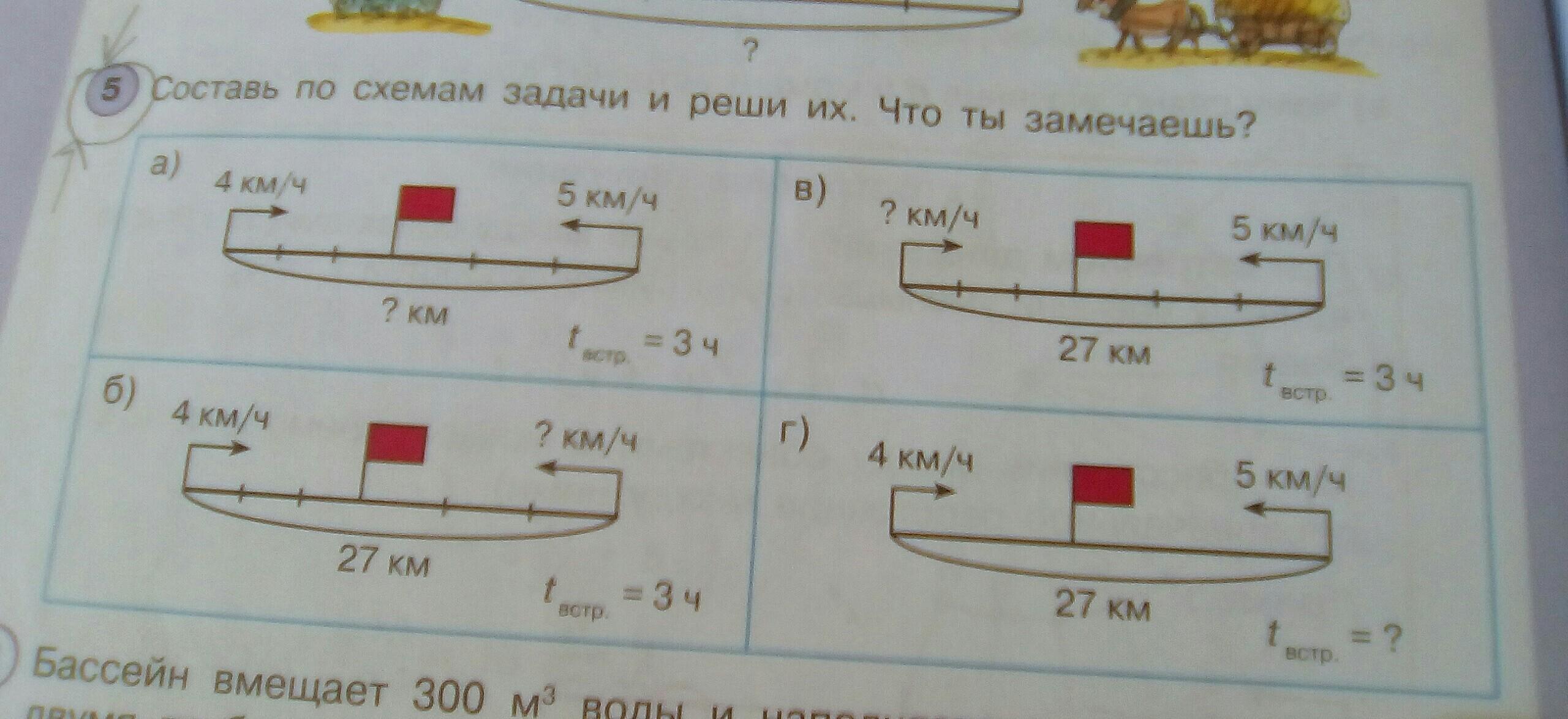 в)Из двух деревень одновреммено, на встречу друг другу выехали два велосипедиста. Скорость первого неизвестна, а скорость второго равна 5 кмч. Расстояние между деревнями равно 27 км. Через 3 часа они встретелись. Вопрос - какова скорость первого велосепедиста.