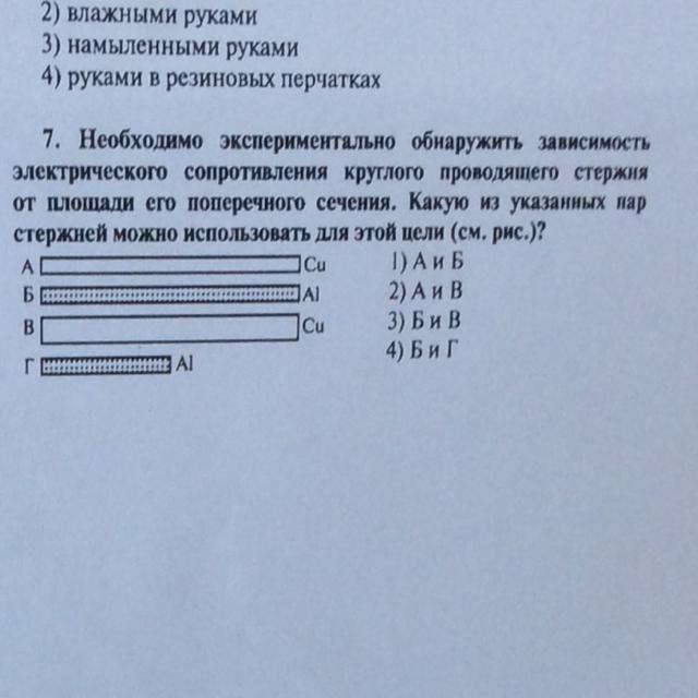 Необходимо экспериментально обнаружить зависимость электрическогосопротивления круглого проводящего стержня от площади его поперечного сечения. Какую из указанных пар стержней можно использовать для этой цели ?