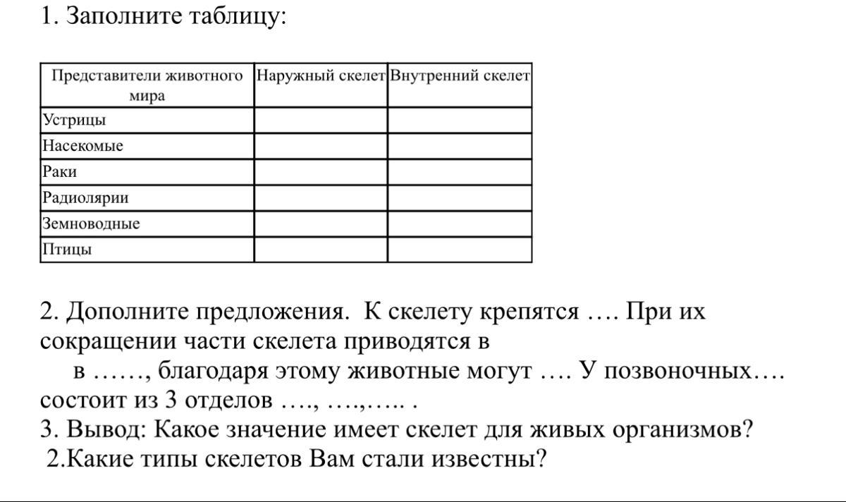 задание 2: мышцы, в движение, передвигаться. Внутрений скелет, головы, туловища,конечностей.