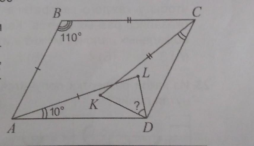 В параллелограмме ABCD (AB ll CD и BC ll AD) отмечены точки K и L (см. рисунок). Известно, что угол ABC равен 110 градусов, угол LAD равен углу KCD равен 10 градусам, AL равен AB и KC равен BC. Найдите угол KDL.