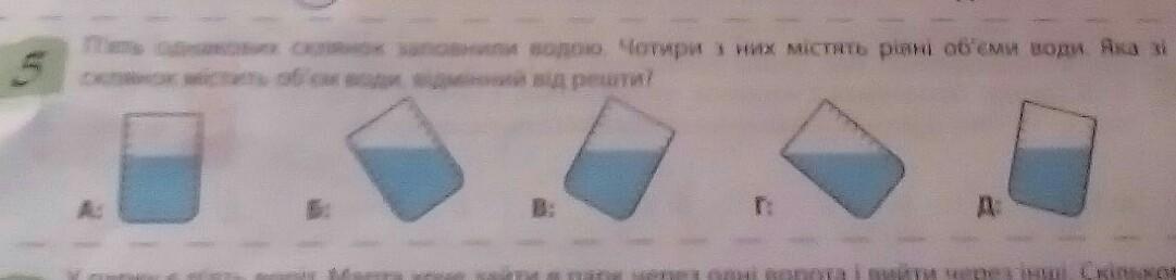 П'ять однакових склянок заповнили водою. Чотири з них містять рівні об'єми води. Яка зі склянок містить об'єм води, відмінний від решти?