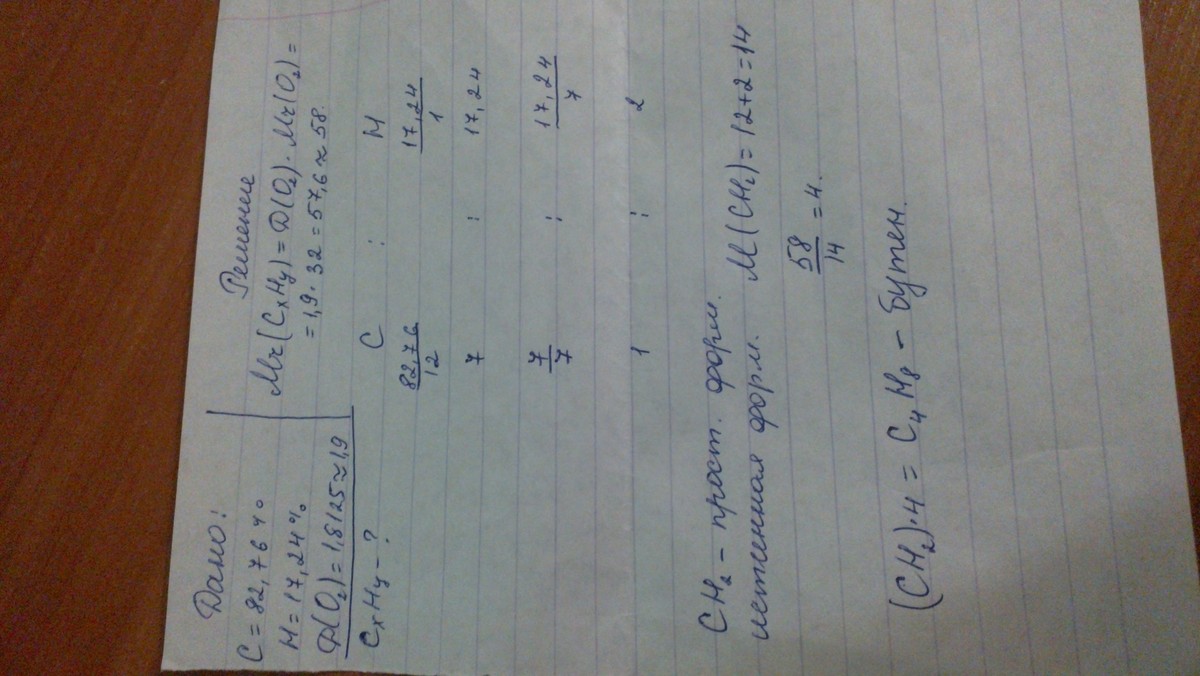 Напишите молекулярную формулу соединения, элементарный состав которого в массовых долях следующий: 82,76% углерода; 17,24% водорода. Относительная плотность вещества по кислороду равна 1,8125