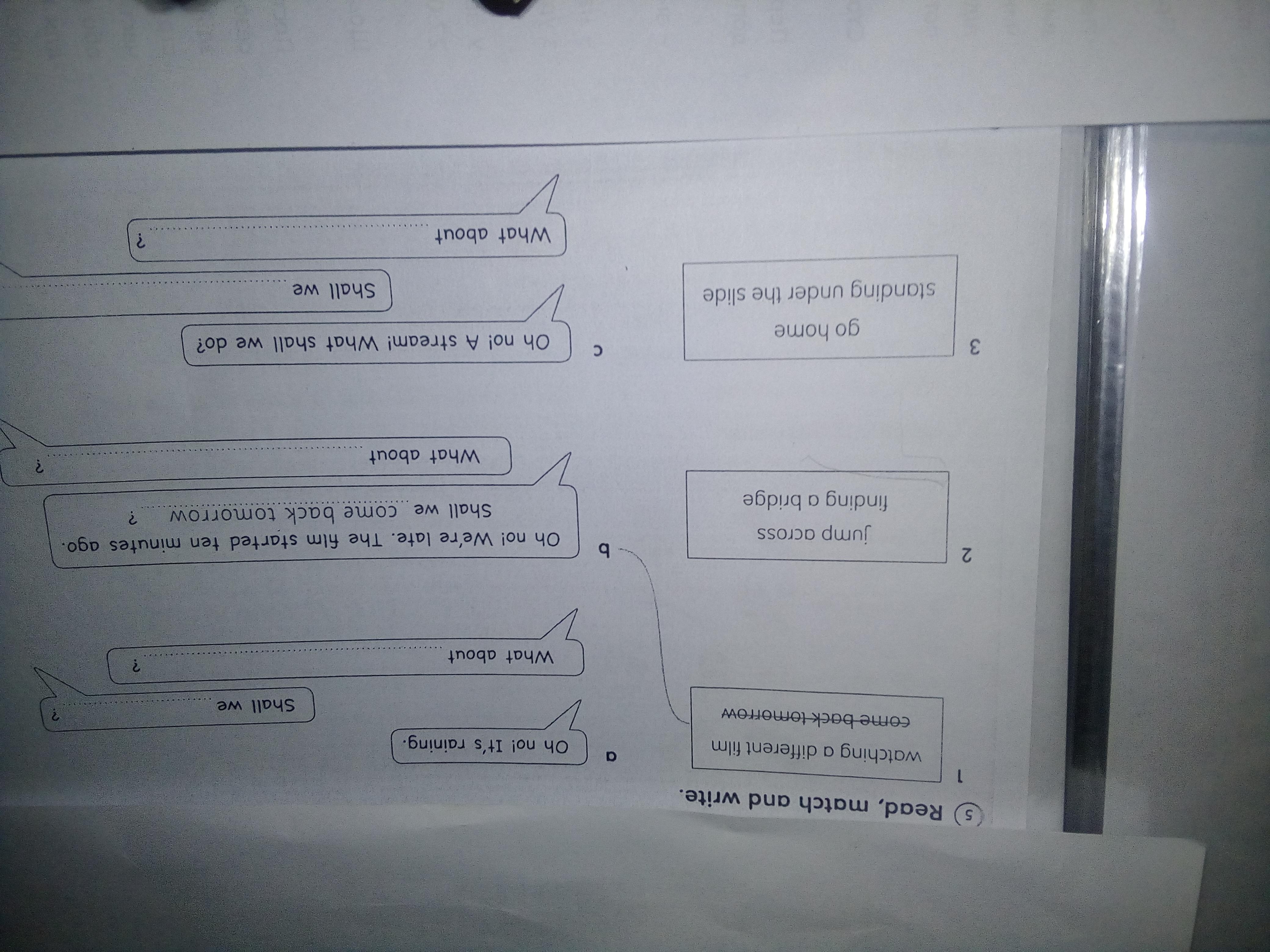 1) shall we go home, what about standing under the slide 2)what about watching a different film 3) Shall we finding a bridge, what about jump across